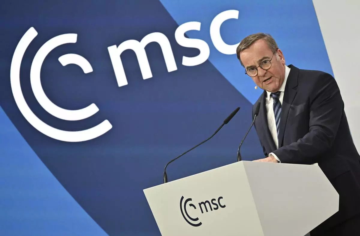 German Minister of Defense Boris Pistorius speaks during the Munich Security Conference, Germany, Friday Feb. 14, 2025. (Peter Kneffel/dpa via AP)