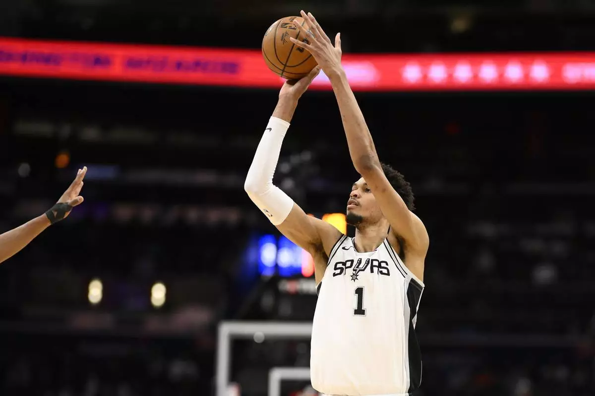 San Antonio Spurs center Victor Wembanyama looks to shoot during the first half of an NBA basketball game against the Washington Wizards, Monday, Feb. 10, 2025, in Washington. (AP Photo/Nick Wass)