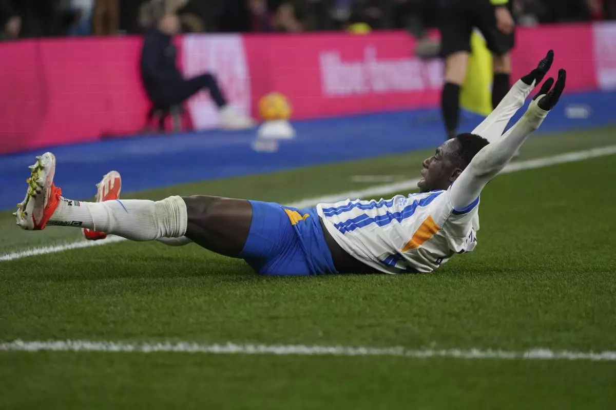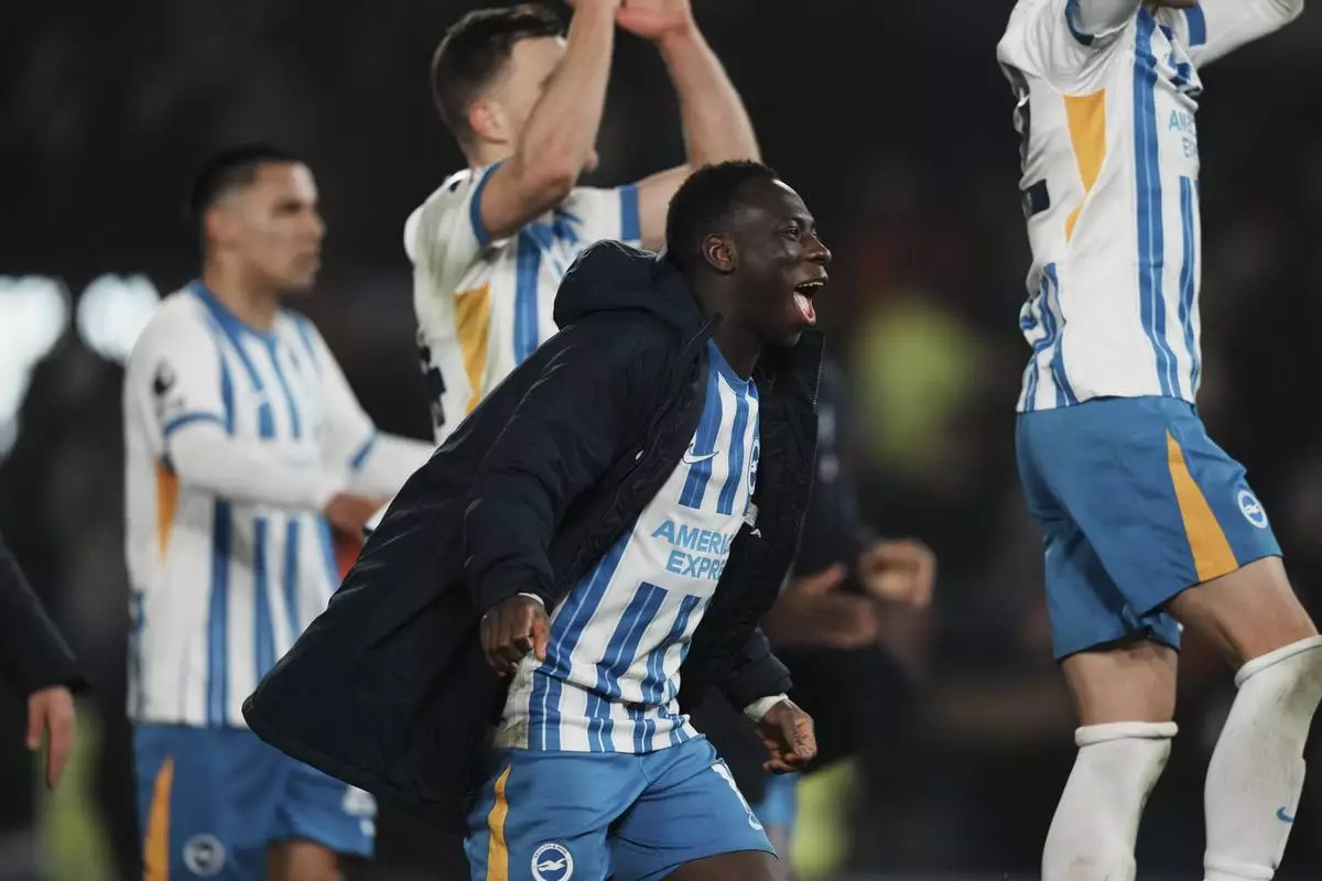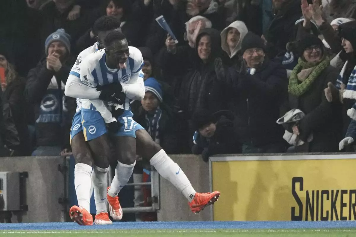 Brighton's Yankuba Minteh celebratees after the English Premier League soccer match between Brighton and Chelsea in Brighton, England, Friday, Feb. 14, 2025. (AP Photo/Dave Shopland)