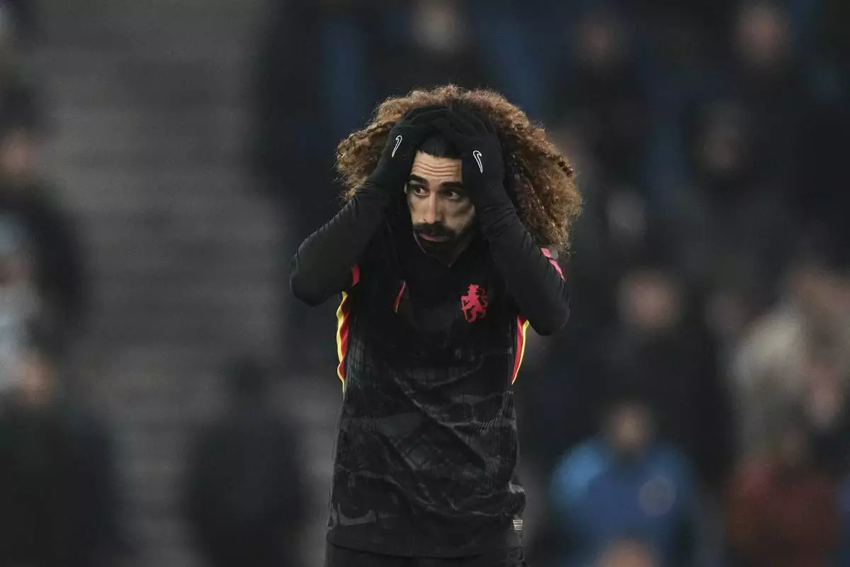 Chelsea's Marc Cucurella reacts during the English Premier League soccer match between Brighton and Chelsea in Brighton, England, Friday, Feb. 14, 2025. (AP Photo/Dave Shopland)