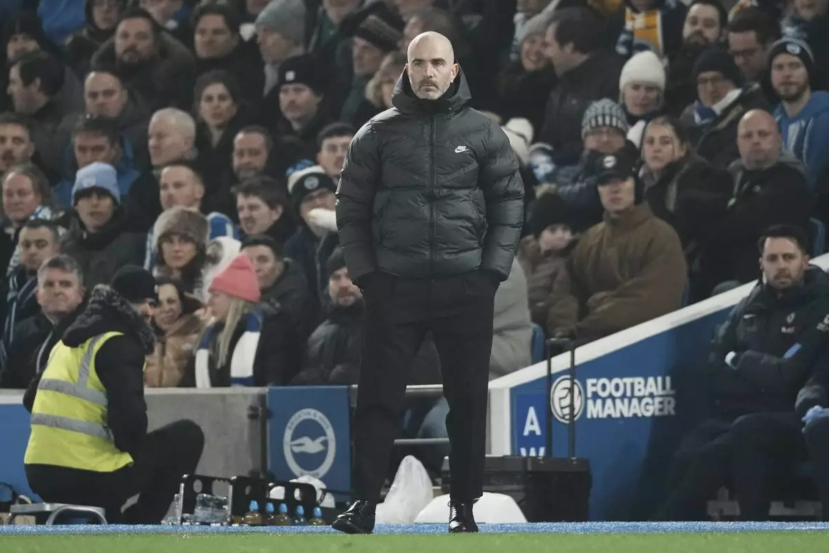 Chelsea's head coach Enzo Maresca stands during the English Premier League soccer match between Brighton and Chelsea in Brighton, England, Friday, Feb. 14, 2025. (AP Photo/Dave Shopland)