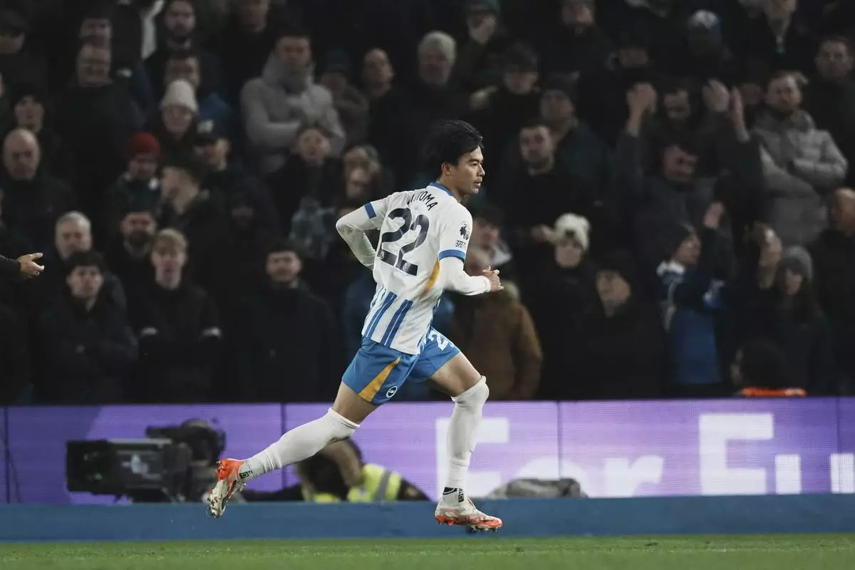 Brighton's Kaoru Mitoma runs after he scored during the English Premier League soccer match between Brighton and Chelsea in Brighton, England, Friday, Feb. 14, 2025. (AP Photo/Dave Shopland)