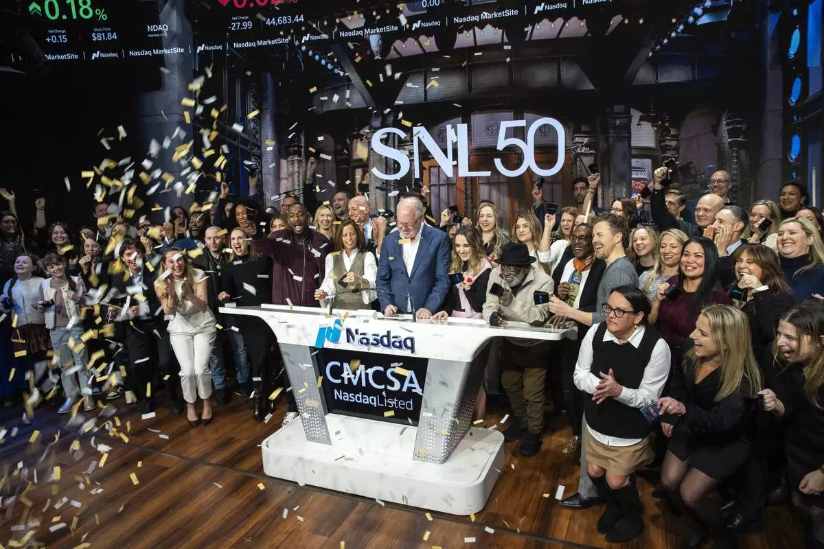 Mark Marshall, center, chairman of Global Advertising & Partnerships, NBCUniversal, and current and veteran members of the SNL cast, celebrate SNL as they ring the Nasdaq opening bell, in New York's Times Square, Friday, Feb. 14, 2025. (AP Photo/Eduardo Munoz Alvarez)