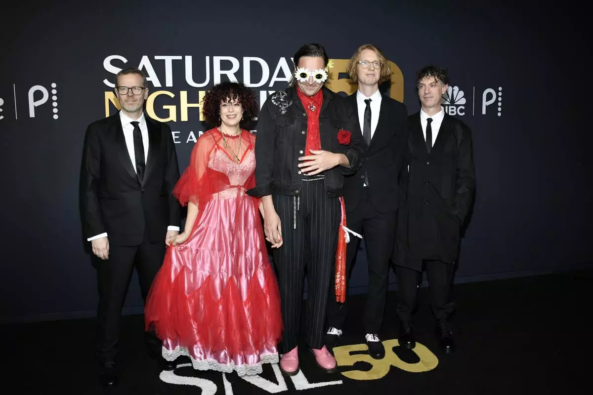 Tim Kingsbury, from left, Regine Chassagne, Win Butler, Richard Reed Parry, and Jeremy Gara of Arcade Fire attend "SNL50: The Anniversary Special" at Rockefeller Plaza on Sunday, Feb. 16, 2025, in New York. (Photo by Evan Agostini/Invision/AP)