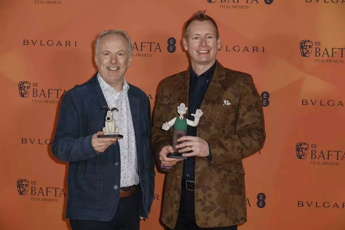 Nick Park, left, and Merlin Crossingham pose for photographers upon arrival at the BAFTA Nominees Party on Saturday, Feb. 15, 2025, in London. (Photo by Joel C Ryan/Invision/AP)