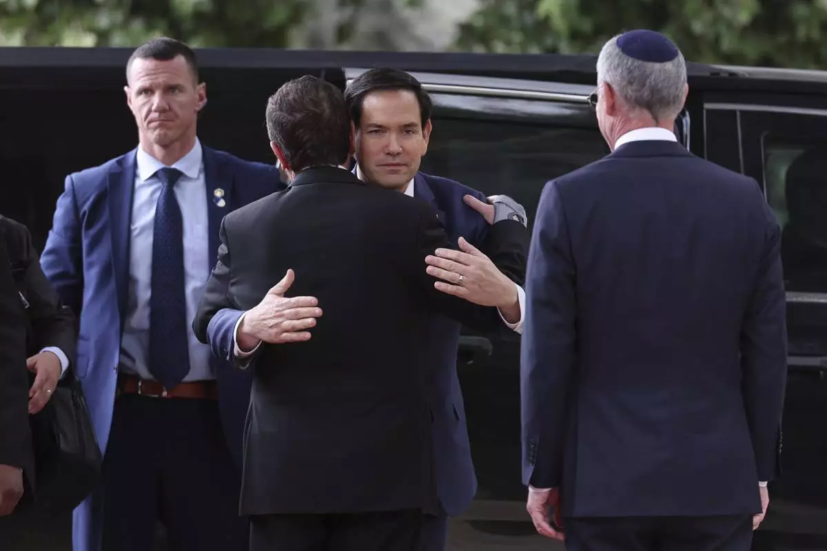 U.S. Secretary of State Marco Rubio hugs Israeli president Isaac Herzog, back to the camera, as they meet in Jerusalem, Israel, Sunday Feb. 16, 2025. (Abir Sultan/Pool Photo via AP)