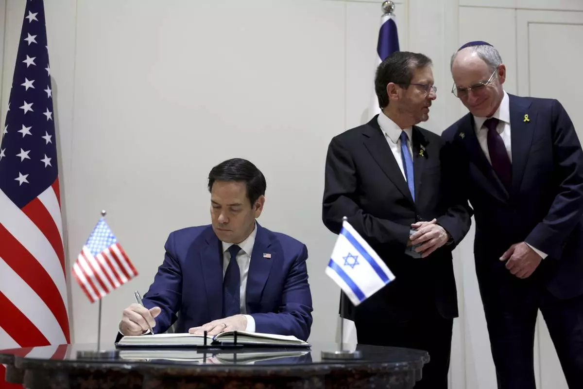 U.S. Secretary of State Marco Rubio signs the guest book during his meeting with Israeli President Isaac Herzog in Jerusalem, Israel, Sunday Feb. 16, 2025. (Evelyn Hockstein, Pool Photo via AP)