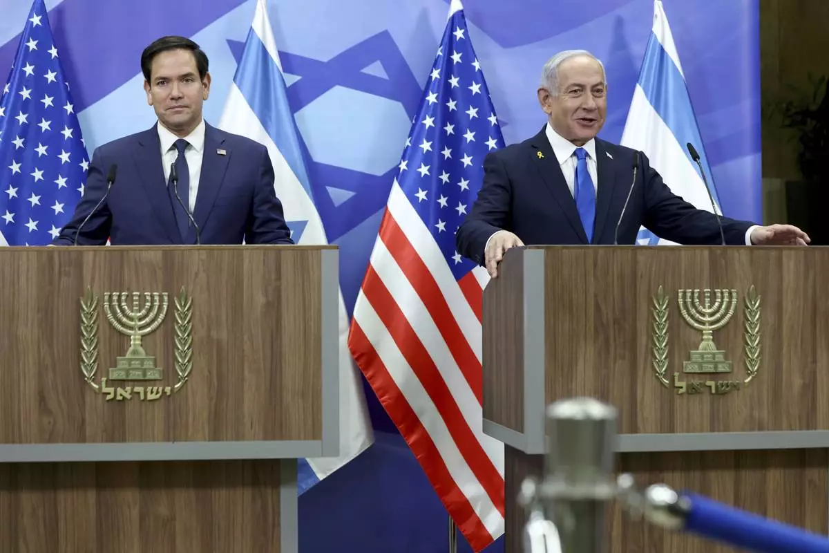 U.S. Secretary of State Marco Rubio attends a joint news conference with Israeli Prime Minister Benjamin Netanyahu at the Prime Minister's office in Jerusalem, Israel, Sunday, Feb. 16, 2025. (AP Photo/Ohad Zwigenberg, pool)