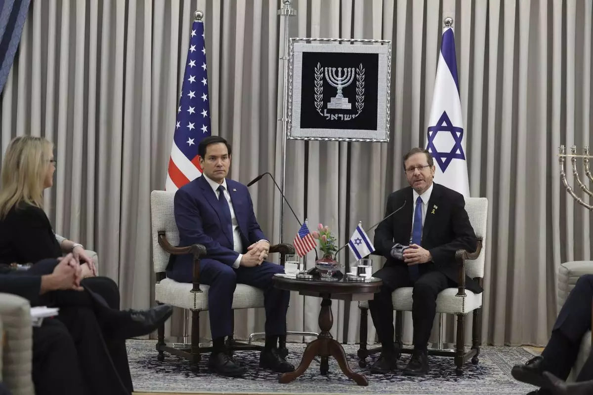 U.S. Secretary of State Marco Rubio, centre left, meets with Israeli President Isaac Herzog in Jerusalem, Israel, Sunday Feb. 16, 2025. (Abir Sultan/Pool Photo via AP)