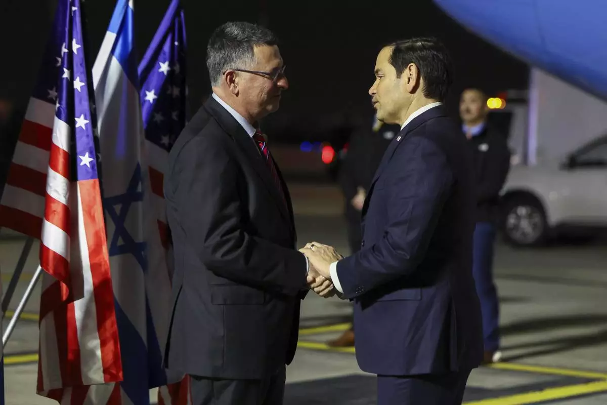 Israel's Foreign Minister Gideon Sa'ar shakes hands with U.S. Secretary of State Marco Rubio as he arrives in Israel, on the first leg of his Middle East trip, in Tel Aviv, Israel, Saturday, Feb. 15, 2025. (Evelyn Hockstein/Pool Photo via AP)