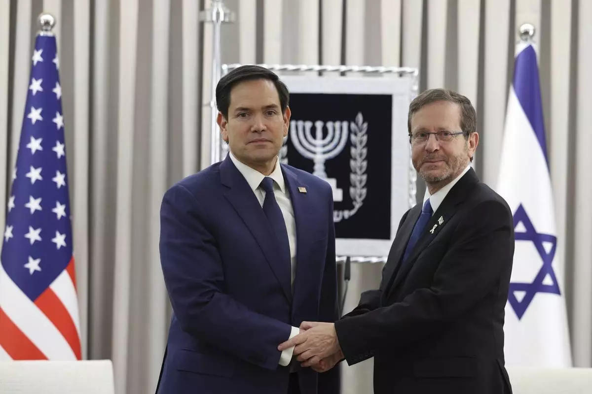 U.S. Secretary of State Marco Rubio, left, shakes hands with Israeli President Isaac Herzog during their meeting in Jerusalem, Israel, Sunday Feb. 16, 2025. (Abir Sultan/Pool Photo via AP)