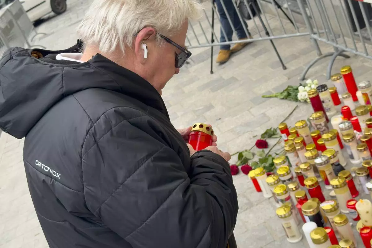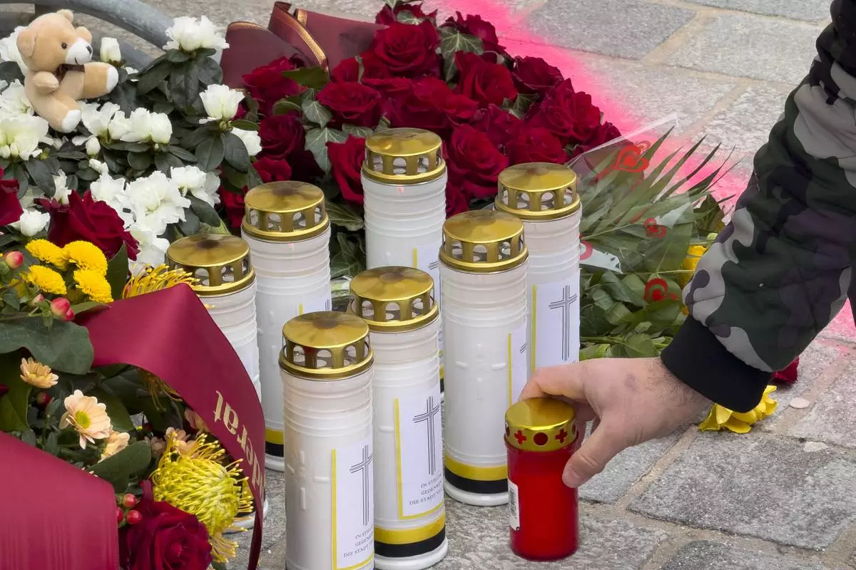 A man lights a candle at the site of stabbing a day after an attack that left a 14-year-old dead and five others injured, in Villach, Austria, Sunday, Feb. 16, 2025. (AP Photo/Darko Bandic)