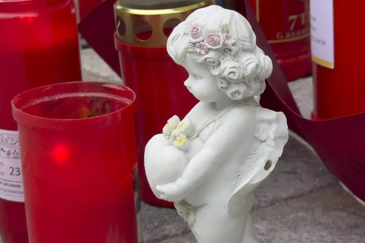 A figurine of angel is placed with candles at the site of stabbing a day after an attack that left a 14-year-old dead and five others injured, in Villach, Austria, Sunday, Feb. 16, 2025. (AP Photo/Darko Bandic)
