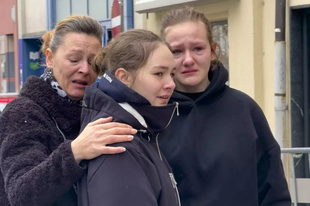 People mourn at the site of stabbing a day after an attack that left a 14-year-old dead and five others injured, in Villach, Austria, Sunday, Feb. 16, 2025. (AP Photo/Darko Bandic)
