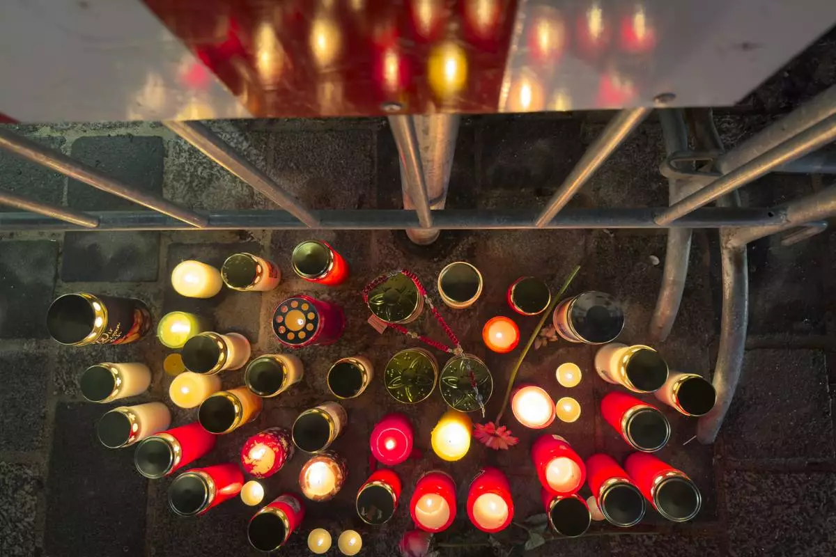 Candles are lit at the site of a stabbing attack in Villach, Austria, Sunday, Feb. 16, 2025. (AP Photo/Darko Bandic)