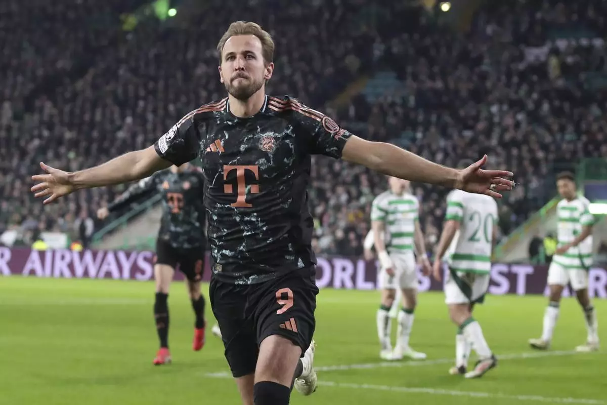 Bayern's Harry Kane celebrates after scoring his side's second goal during the Champions League play off first leg soccer match between Celtic Glasgow and Bayern Munich at the Celtic Park Stadium in Glasgow, Scotland, Wednesday, Feb. 12, 2025. (AP Photo/Scott Heppell)