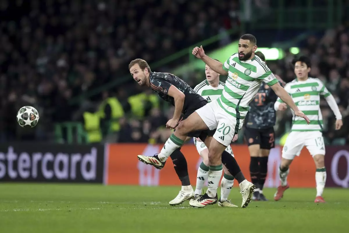 Bayern's Harry Kane heads the ball besides Celtic's Cameron Carter-Vickers during the Champions League play off first leg soccer match between Celtic Glasgow and Bayern Munich at the Celtic Park Stadium in Glasgow, Scotland, Wednesday, Feb. 12, 2025. (AP Photo/Scott Heppell)