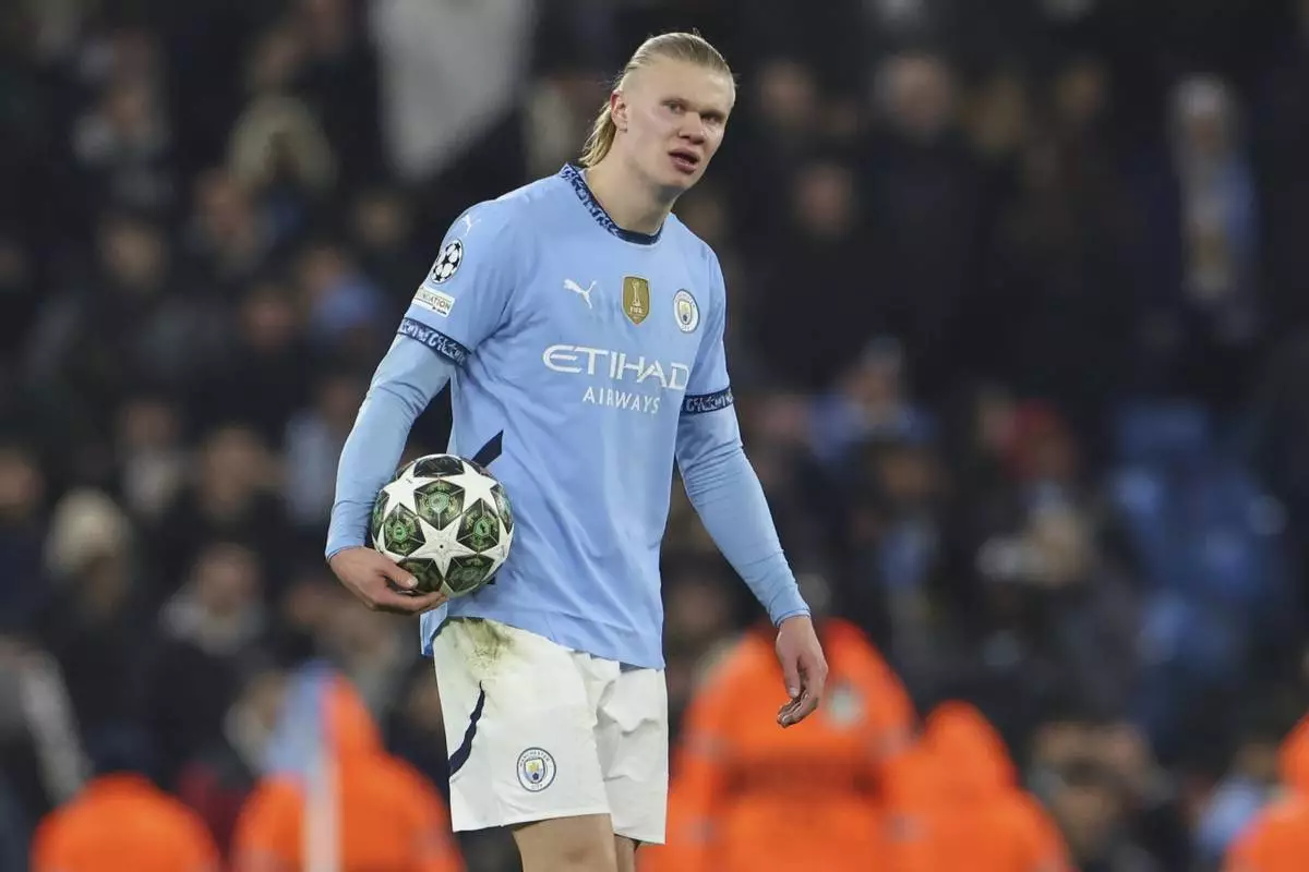 Manchester City's Erling Haaland reacts after the Champions League playoff first leg soccer match between Manchester City and Real Madrid at the Etihad Stadium in Manchester, England, Tuesday, Feb. 11, 2025. (AP Photo/Darren Staples)