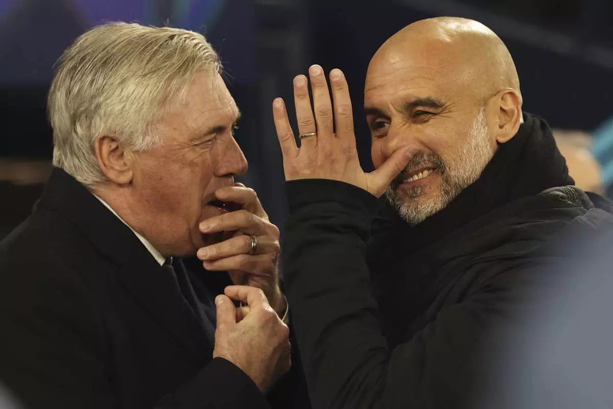 Real Madrid's head coach Carlo Ancelotti, left and Manchester City's head coach Pep Guardiola share a laugh before the Champions League playoff first leg soccer match between Manchester City and Real Madrid at the Etihad Stadium in Manchester, England, Tuesday, Feb. 11, 2025. (AP Photo/Darren Staples)
