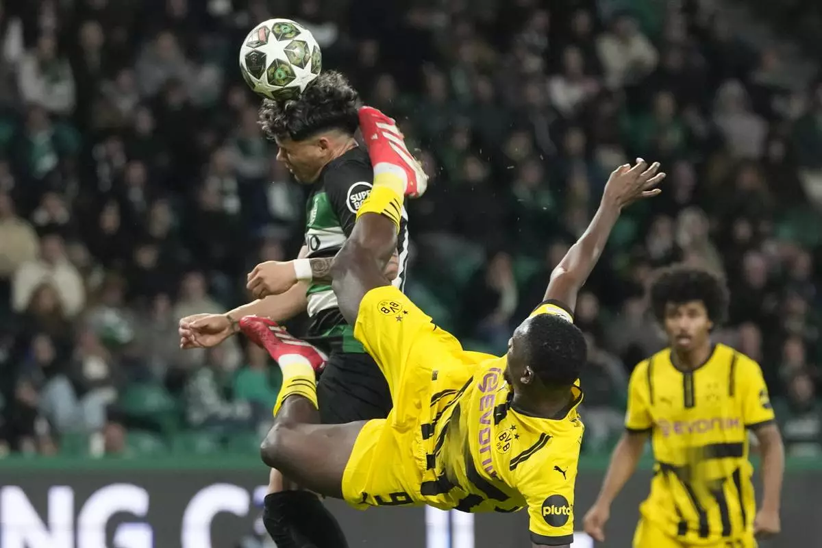 Dortmund's Serhou Guirassy challenges for the ball with Sporting's Maximiliano Araujo during the Champions League playoff first leg soccer match between Sporting CP and Borussia Dortmund at the Alvalade stadium in Lisbon, Portugal, Tuesday, Feb. 11, 2025. (AP Photo/Armando Franca)