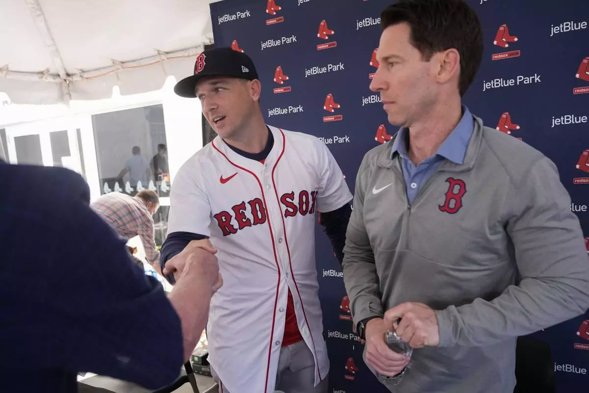 Alex Bregman, left, greets media with Craig Breslow, chief baseball officer for the Boston Red Sox, at a news conference after signing a three year contract with the Red Sox in Fort Myers, Fla., Sunday, Feb. 16, 2025. (AP Photo/Gerald Herbert)