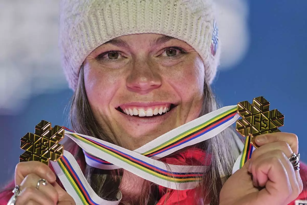 United States' Breezy Johnson shows her gold medal for a women's downhill and for a women's team combined event, at the Alpine Ski World Championships, in Saalbach-Hinterglemm, Austria, Tuesday, Feb. 11, 2025. (AP Photo/Giovanni Auletta)