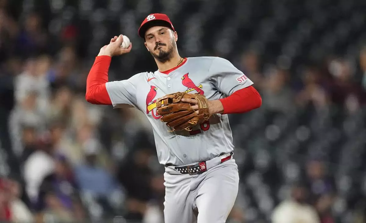 FILE - St. Louis Cardinals third baseman Nolan Arenado throws to first base in the ninth inning of a baseball game Sept. 25, 2024, in Denver. (AP Photo/David Zalubowski, File)