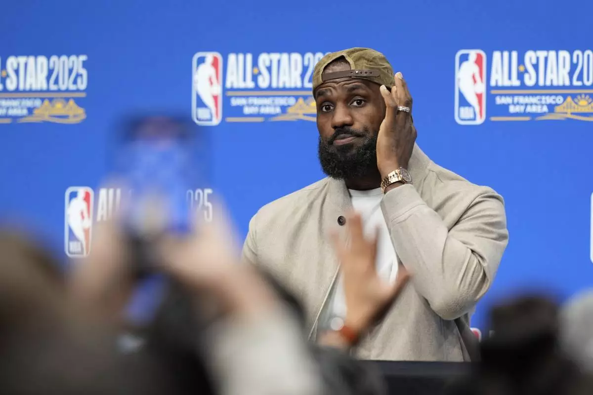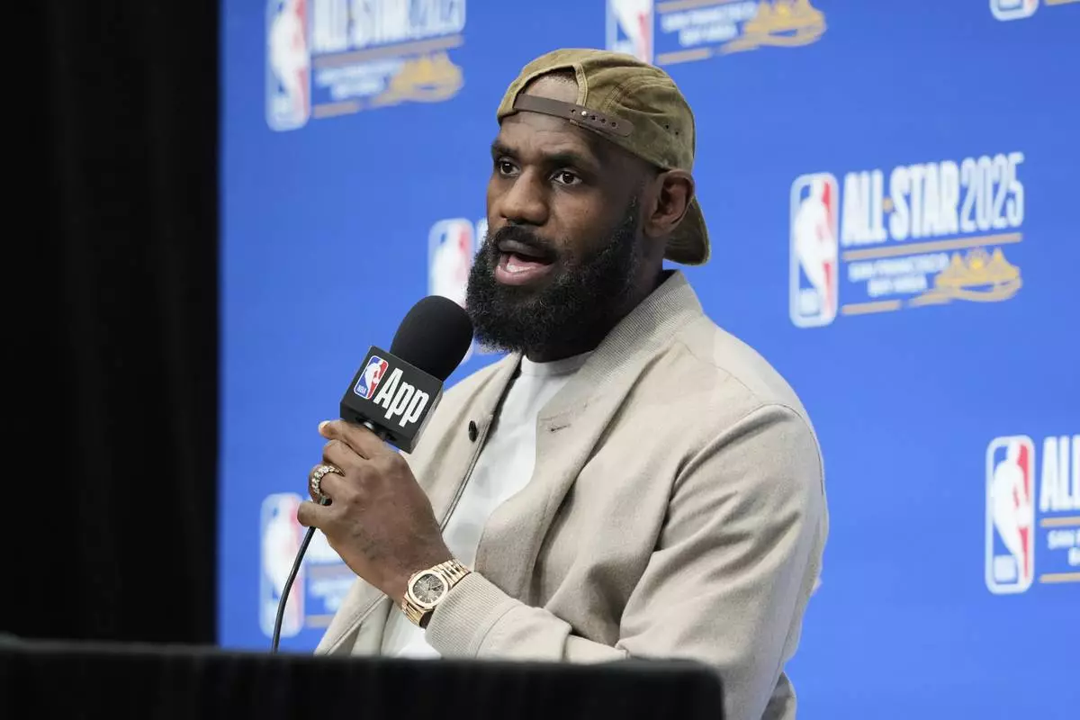 Los Angeles Lakers forward LeBron James speaks during a press conference before the NBA basketball All-Star game Sunday, Feb. 16, 2025, in San Francisco. (AP Photo/Godofredo A. Vásquez)