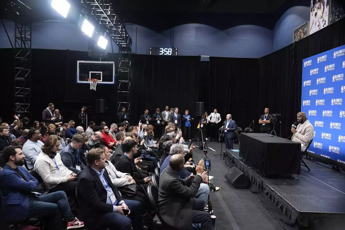 Los Angeles Lakers forward LeBron James fields questions during a press conference before the NBA basketball All-Star game Sunday, Feb. 16, 2025, in San Francisco. (AP Photo/Godofredo A. Vásquez)