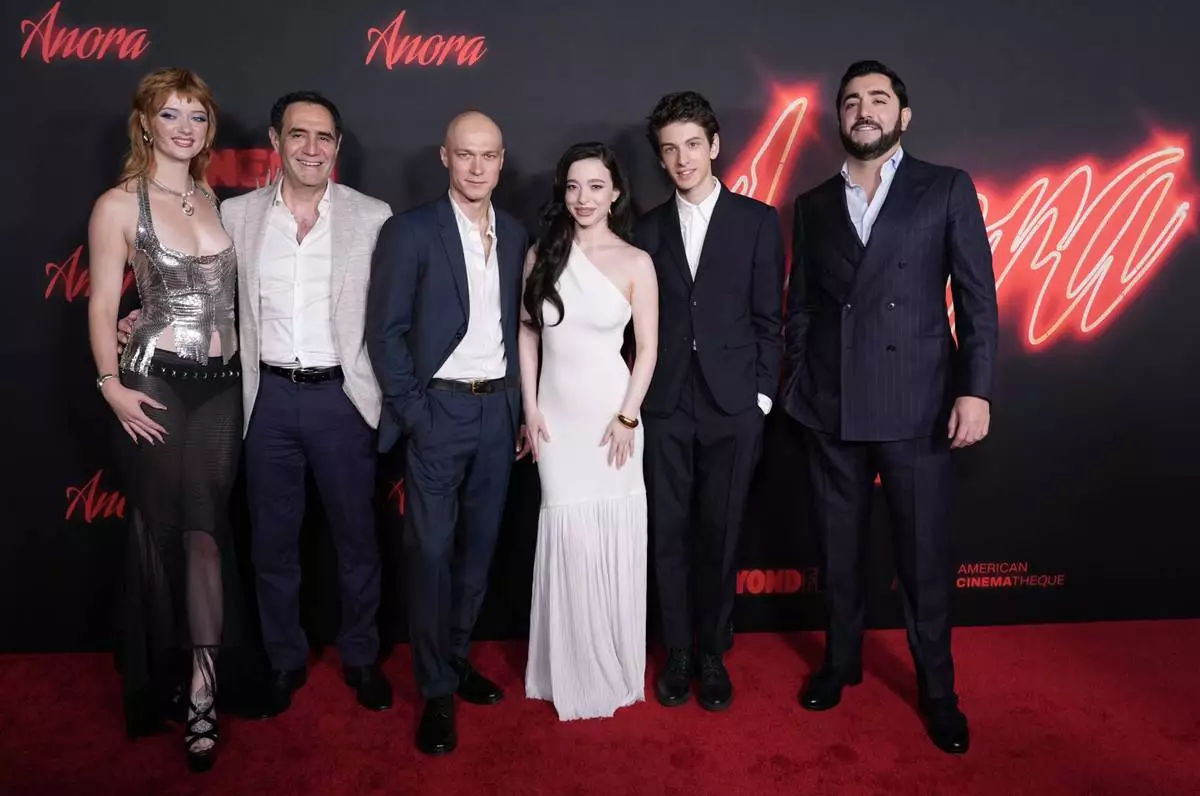 FILE - Cast members, from left, Lindsey Normington, Karren Karagulian, Yura Borisov, Mikey Madison, Mark Eydelshteyn and Vache Tovmasyan pose together at the premiere of the film "Anora," Tuesday, Oct. 1, 2024, at the Vista Theatre in Los Angeles. (AP Photo/ Chris Pizzello, File)