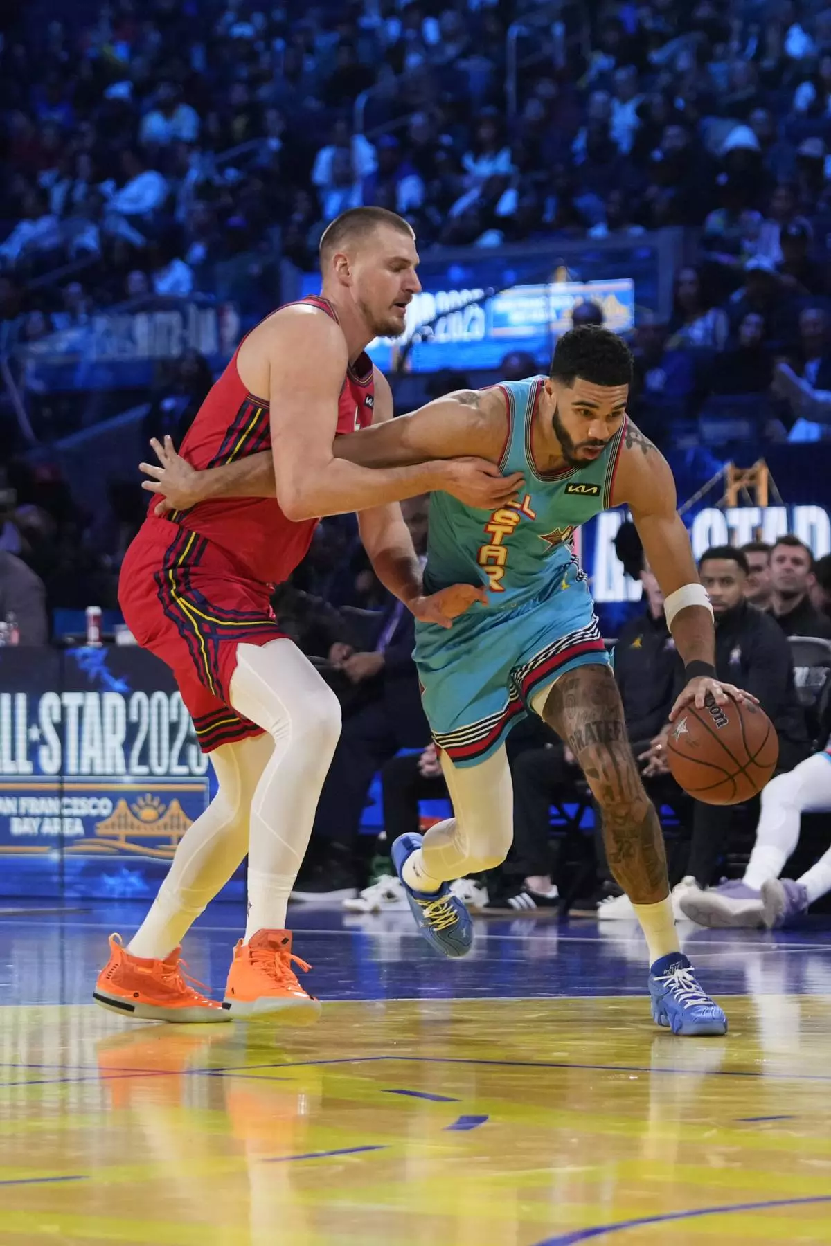 Boston Celtics guard Jayson Tatum dribbles past Denver Nuggets center Nikola Jokic during the NBA All-Star basketball game Sunday, Feb. 16, 2025, in San Francisco. (AP Photo/Godofredo A. Vásquez)