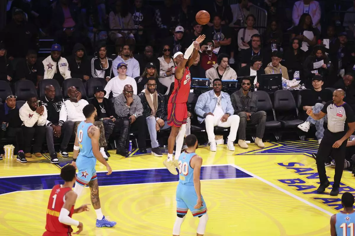 Oklahoma City Thunder guard Shai Gilgeous-Alexander shoots during the NBA All-Star basketball game Sunday, Feb. 16, 2025, in San Francisco. (AP Photo/Jed Jacobsohn)