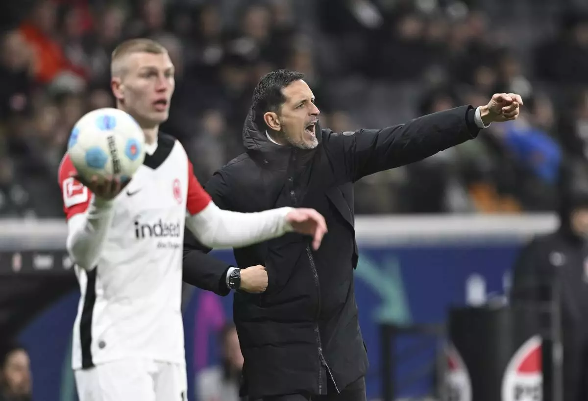 Frankfurt's head coach Dino Toppmoeller gestures during the German Bundesliga soccer match between Eintracht Frankfurt and Holstein Kiel in Frankfurt, Germany, Sunday, Feb. 16, 2025. (Arne Dedert/dpa via AP)