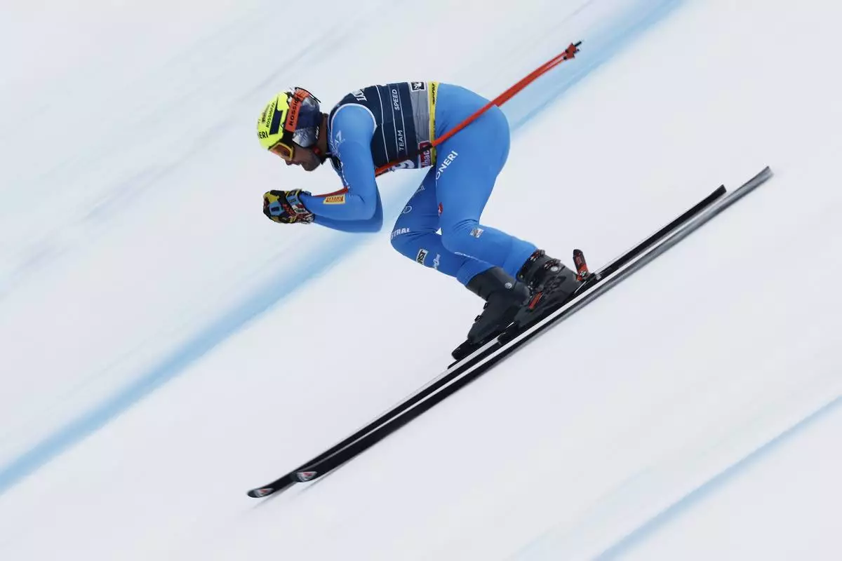 Italy's Christof Innerhofer competes in a downhill run of a men's team combined event, at the Alpine Ski World Championships, in Saalbach-Hinterglemm, Austria, Wednesday, Feb. 12, 2025. (AP Photo/Gabriele Facciotti)