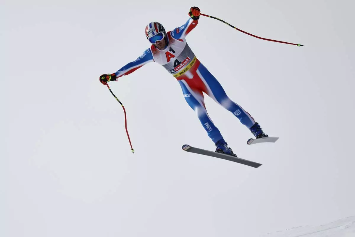 France's Adrien Theaux is airborne during a men's downhill race, at the Alpine Ski World Championships, in Saalbach-Hinterglemm, Austria, Sunday, Feb. 9, 2025. (AP Photo/Gabriele Facciotti)