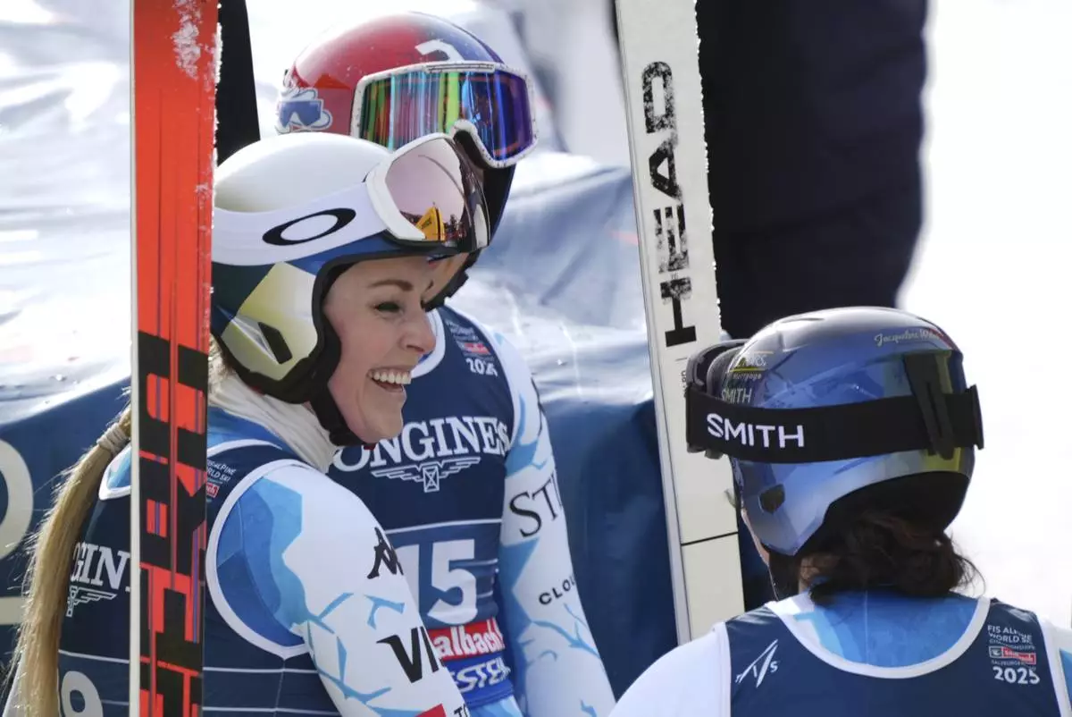 United States' Lindsey Vonn, left, talks to United States' Lauren Macuga and United States' Jacqueline Wiles, right, at the finish area of a downhill run of a women's team combined event, at the Alpine Ski World Championships, in Saalbach-Hinterglemm, Austria, Tuesday, Feb. 11, 2025. (AP Photo/Giovanni Auletta)