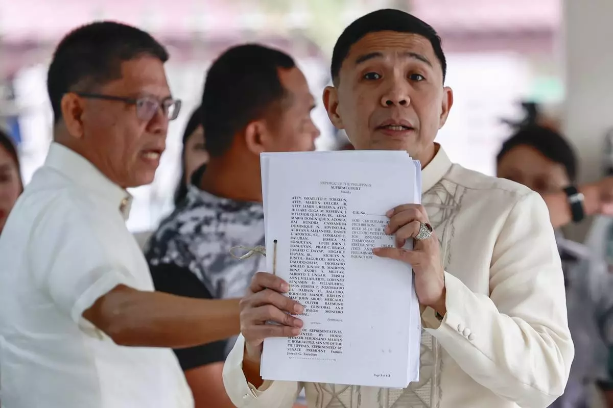 Philippine Vice President Sara Duterte's lawyer Israelito Torreon, right, shows documents they filed asking the 15-member high court to annul her impeachment and block the trial at the Supreme Court in Manila, Philippines Tuesday, Feb. 18, 2025. (AP Photo/Gerard Carreon)