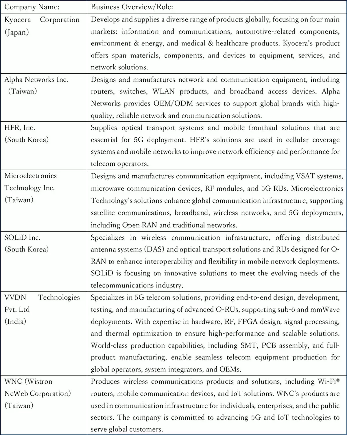 Kyocera will publicly introduce member suppliers to telecom operators. This enables alliance members to pursue global business opportunities, while telecom operators gain the flexibility to select O-RUs from various suppliers, broadening their system configuration options.