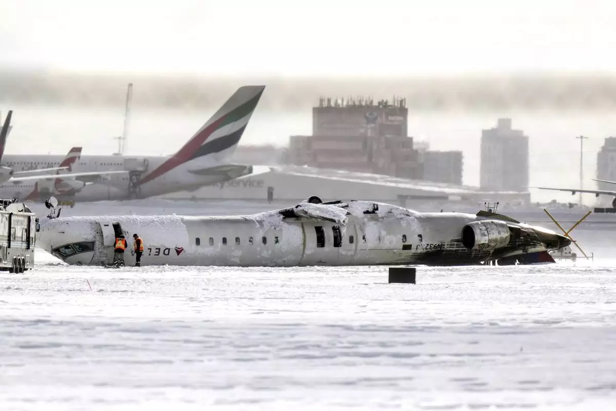 A Delta Air Lines plane lies upside down at Toronto Pearson Airport on Tuesday, Feb. 18, 2025. (Chris Young/The Canadian Press via AP)