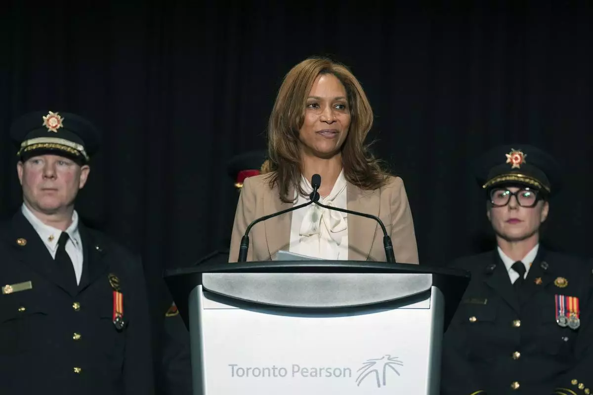 Deborah Flint, CEO of Greater Toronto Airports Authority, addresses the media at Toronto Pearson Airport, Tuesday Feb. 18, 2025. (Chris Young/The Canadian Press via AP)