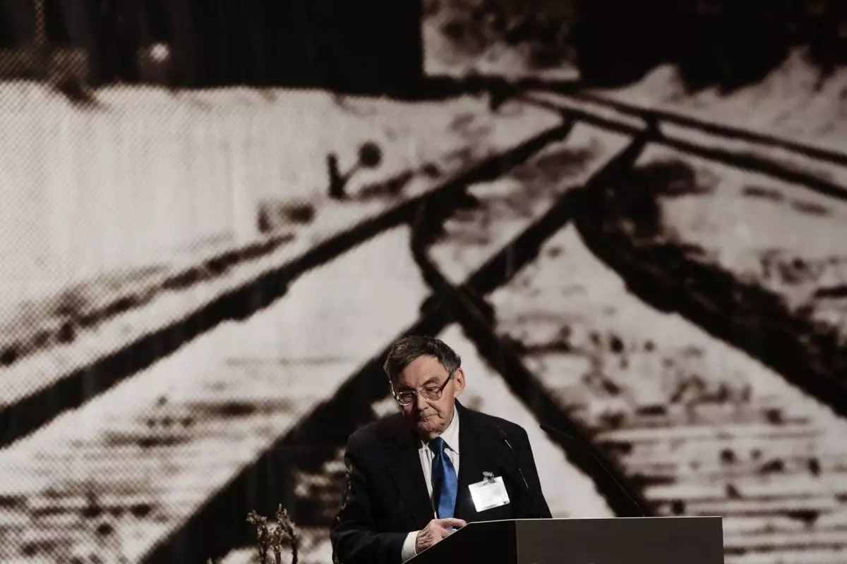 FILE - Auschwitz survivor Marian Turski speaks at an event of the International Auschwitz Committee to commemorate the 70th anniversary of the liberation of the Auschwitz Nazi death camp in Berlin, Jan. 26, 2015. On Jan. 27, 1945 the Red Army liberated the Auschwitz camp. (AP Photo/Markus Schreiber, File)