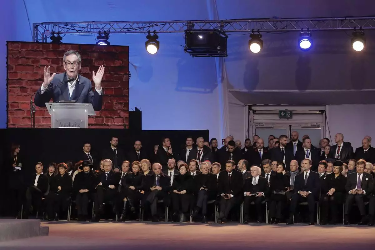 FILE - Heads of State listen to Auschwitz survivor Marian Turski, on the video screen, during a ceremony at the Auschwitz-Birkenau Nazi death camp in Oswiecim, Poland, Jan. 27, 2020. Heads of State and survivors of the Auschwitz-Birkenau death camp gathered Monday for commemorations marking the 75th anniversary of the Soviet army's liberation of the camp, using the testimony of survivors to warn about the signs of rising anti-Semitism and hatred in the world today. (AP Photo/Markus Schreiber, File)
