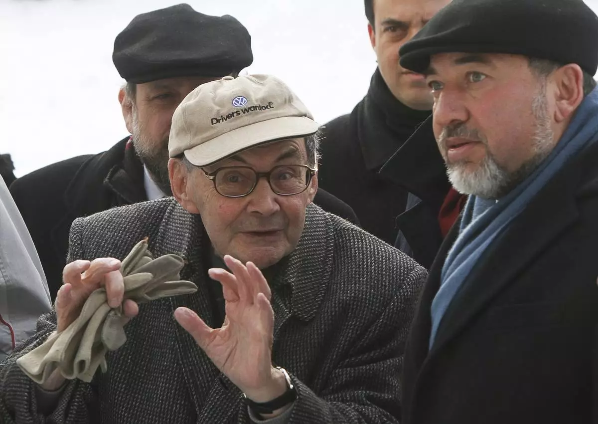 FILE - Israeli Foreign Minister Avigdor Liberman, right,, talks with Marian Turski, a Jewish journalist, after laying a wreath at the Monument to the Fighters of the Warsaw Ghetto in Warsaw, Poland, Jan. 15, 2012. (AP Photo/Czarek Sokolowski, File)