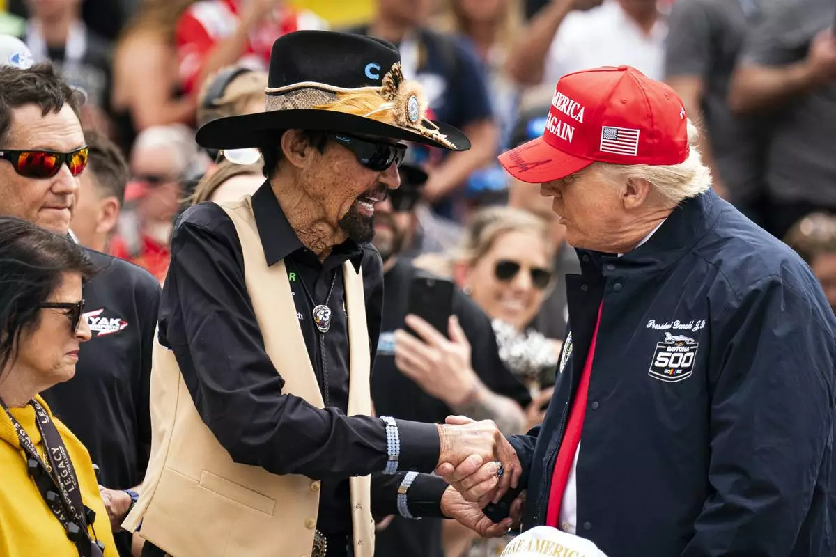 President Donald Trump greets Richard Petty at the NASCAR Daytona 500 auto race at Daytona International Speedway, Sunday, Feb. 16, 2025, in Daytona Beach, Fla. (Pool via AP)