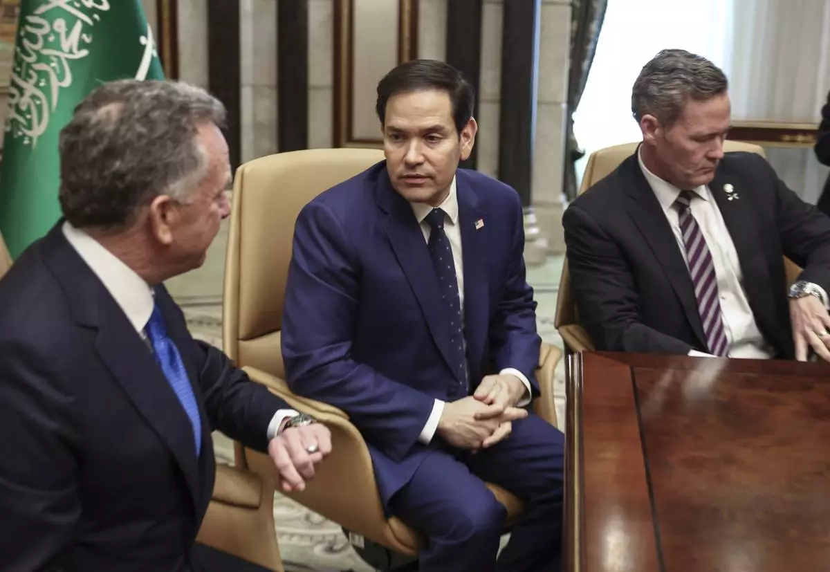 U.S. Secretary of State Marco Rubio, U.S. National Security Advisor Mike Waltz, and U.S. Middle East envoy Steve Witkoff wait to be interviewed after meeting with Russian Foreign Minister Sergei Lavrov and Russian President Vladimir Putin's foreign policy advisor Yuri Ushakov, at Diriyah Palace, in Riyadh, Saudi Arabia, Tuesday, Feb. 18, 2025. (Evelyn Hockstein/Pool Photo via AP)