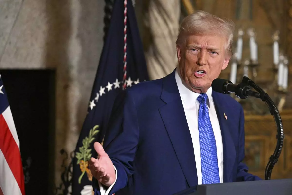 President Donald Trump speaks at Mar-a-Lago in Palm Beach, Fla., Tuesday, Feb. 18, 2025. (Pool via AP)
