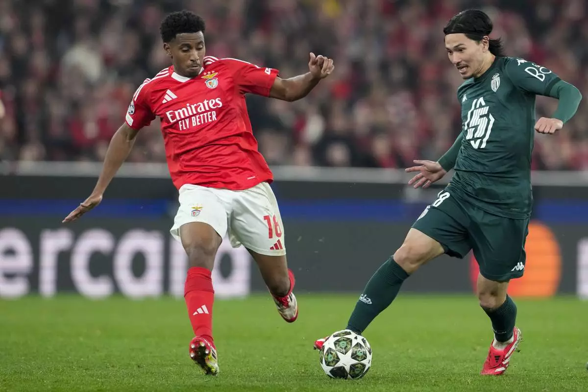 Monaco's Takumi Minamino, right, duels for the ball with Benfica's Leandro Barreiro during a Champions League playoff second leg soccer match between SL Benfica and AS Monaco at the Luz stadium in Lisbon, Tuesday, Feb. 18, 2025. (AP Photo/Armando Franca)