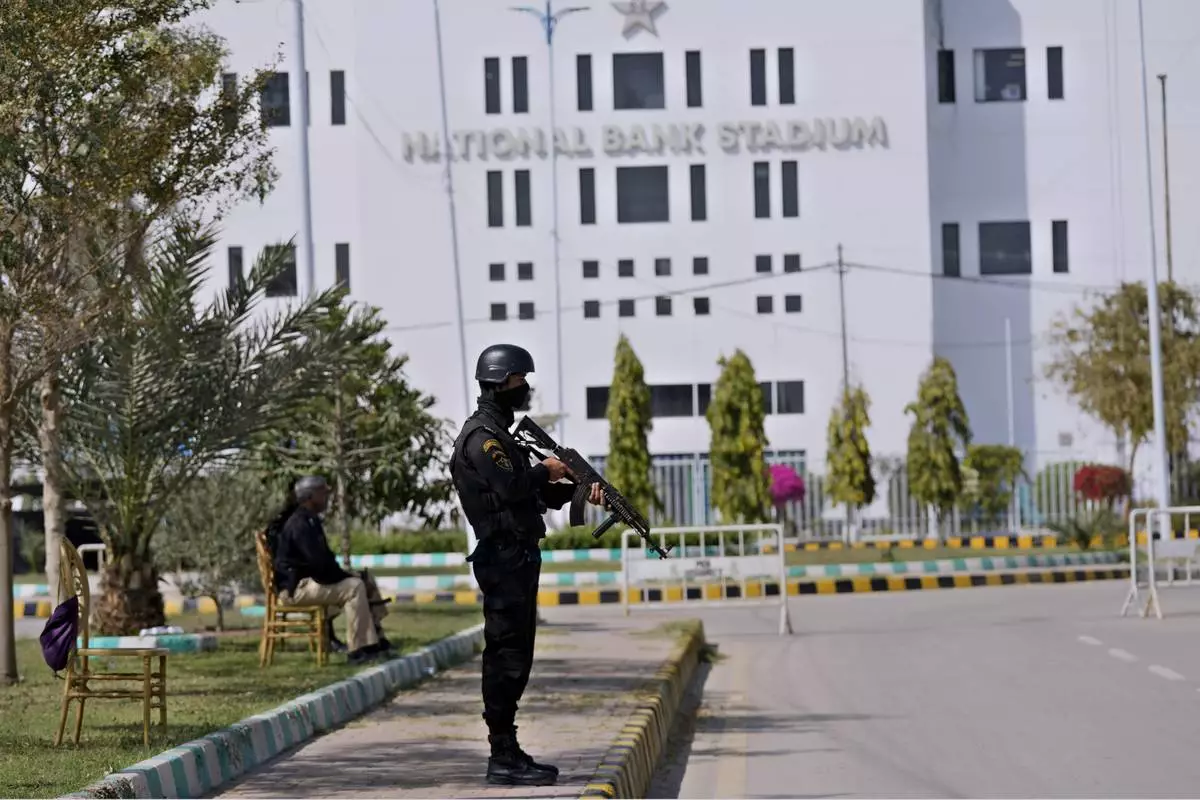 Police officers stand guard to ensure security outside the National Bank Stadium, where final preparations are going on for upcoming ICC Champions Trophy 2025, in Karachi, Pakistan, Sunday, Feb. 16, 2025. (AP Photo/Fareed Khan)