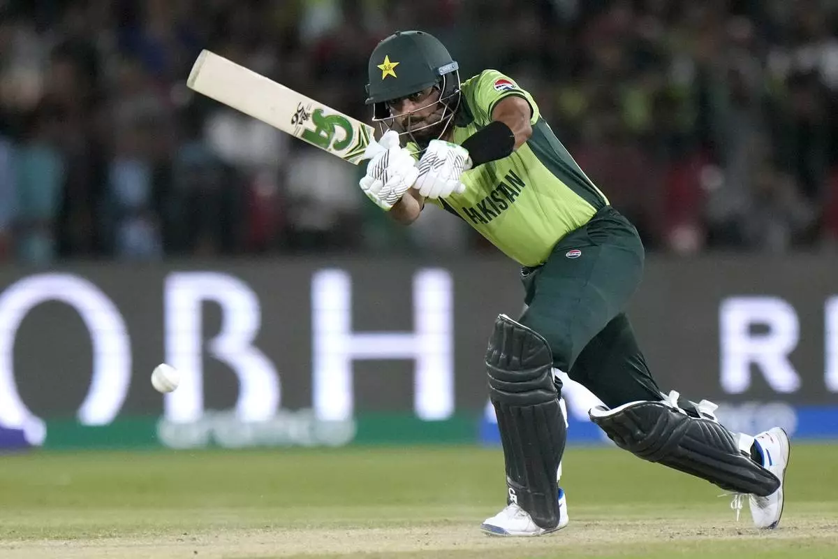 Pakistan's Babar Azam plays a shot during the ICC Champions Trophy cricket match between Pakistan and New Zealand, in Karachi, Pakistan Wednesday, Feb. 19, 2025. (AP Photo/Anjum Naveed)