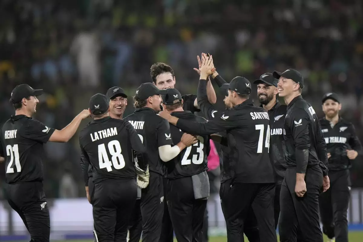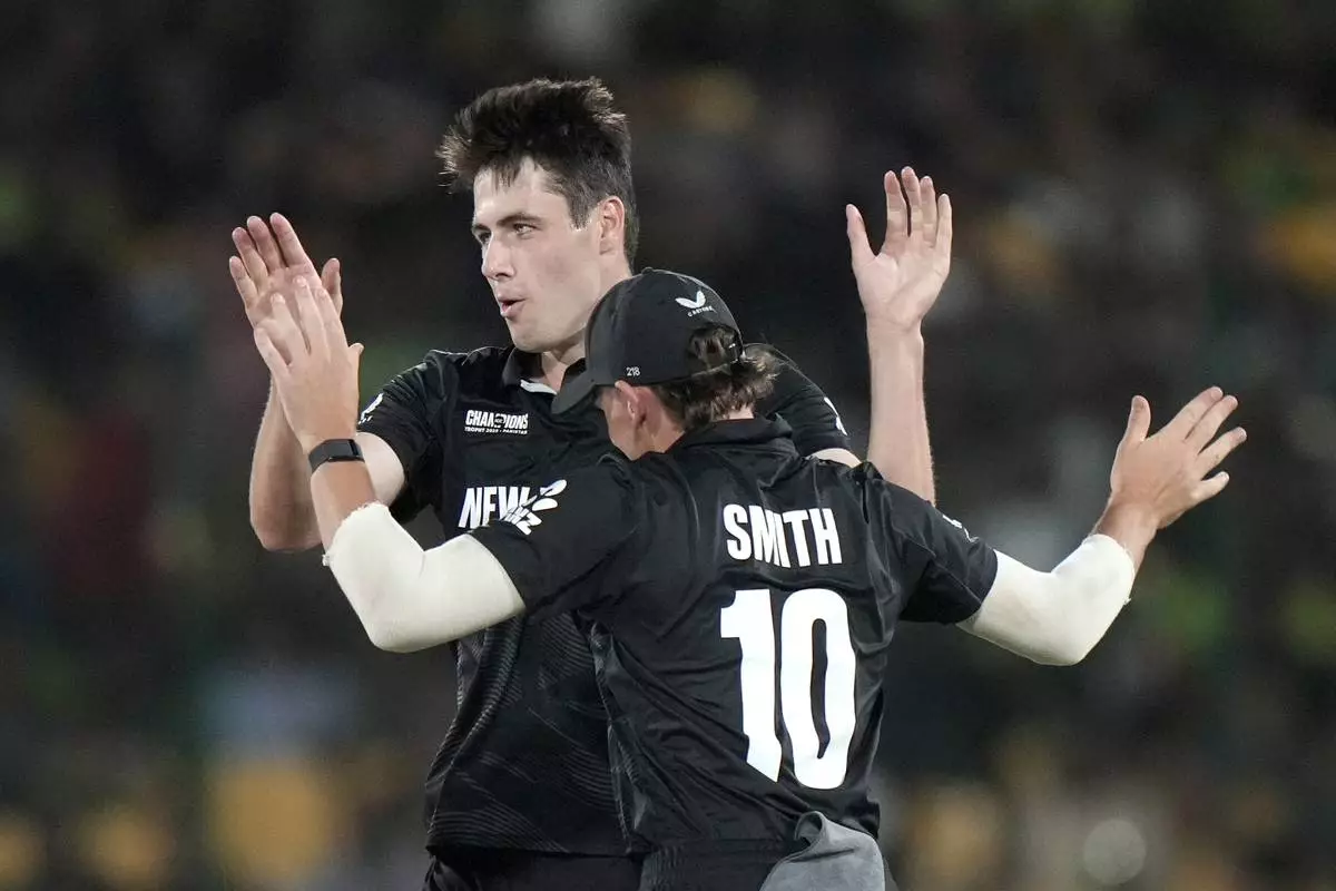 New Zealand's Will O' Rourke, back, celebrates with teammate after taking the wicket of Pakistan's Saud Shakeel during the ICC Champions Trophy cricket match between Pakistan and New Zealand, in Karachi, Pakistan Wednesday, Feb. 19, 2025. (AP Photo/Anjum Naveed)